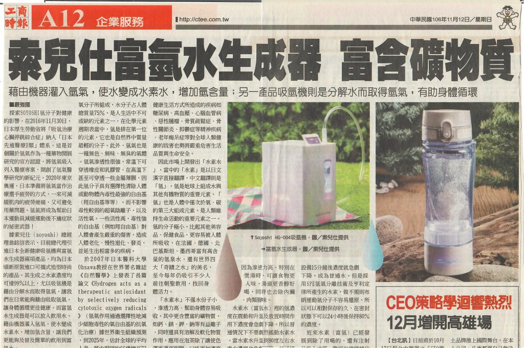 據索兒仕(soyoshi)總經理翁銘信表示,目前總代理引進日本全新健康吸氫機與富氫水生成器兩項產品,均為日本頃新原裝進口可攜式造型時尚的產品,其生成之水素濃度均可達99%以上,尤以吸氫機是藉由分解水而取得氫氣,讓我們在日常能夠藉由吸取氫氣,讓身體循環更佳健康。而富氫水生成器是可以放入飲用水,藉由機器灌入氫氣,使水變成水素水,增加氫含量,讓我們更能夠及普及簡單的飲用到富氫水。